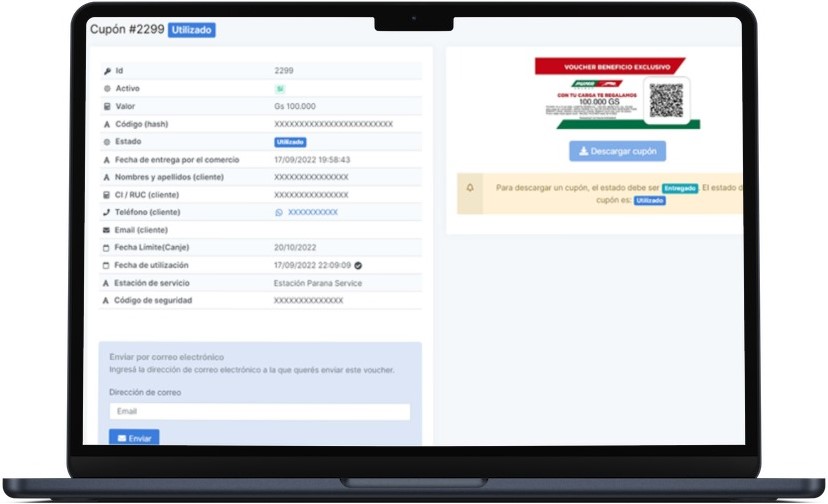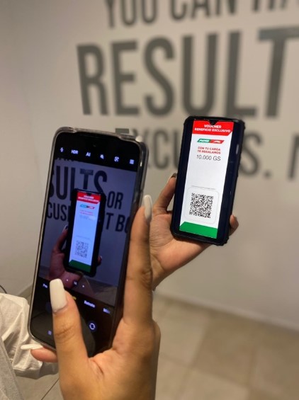 El operario de la estación, al escanear el código QR del voucher (único e irrepetible) validaría en tiempo real y ofrecería al cliente el beneficio en la forma de descuento en la compra de combustibles.